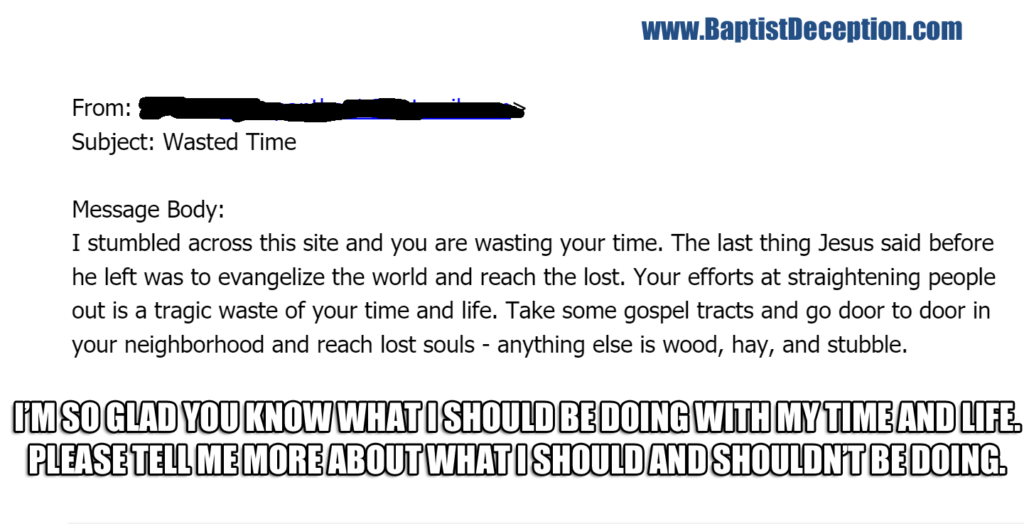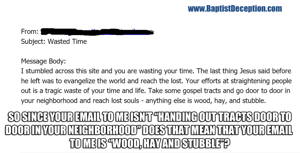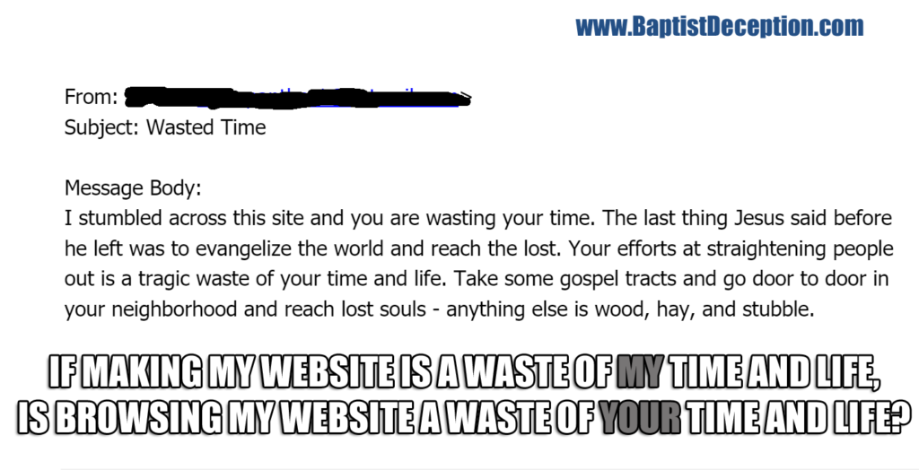 I stumbled across this site and you are wasting your time. The last thing Jesus said before he left was to evangelize the world and reach the lost. Your efforts at straightening people out is a tragic waste of your time and life. Take some gospel tracts and go door to door in your neighborhood and reach lost souls – anything else is wood, hay, and stubble.